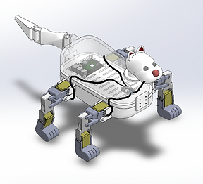 Now that we have narrowed the design considerations down and developed the body and places for the hardware, we determined that it was time for us to choose the optimal mechanism for the leg. This resulted in the choice of a series leg with parallel bars. This leg design allowed the lower portion of the leg to remain adjacent to the ground. Therefore, we did not need to make an ankle joint, and were able avoid placing too much stress on a motor at this joint. The tail was designed to swing freely, and was mostly decorative. As a result, we determined that we should do a topology optimization on it so it has the lowest moment of inertia possible while still being large enough to resemble a real dog tail.