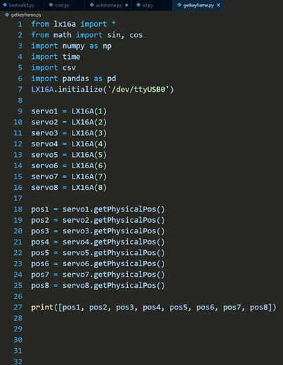 The code on the left is what we use to get the key frames. This just prints the current positions of the motors so we can move between them
